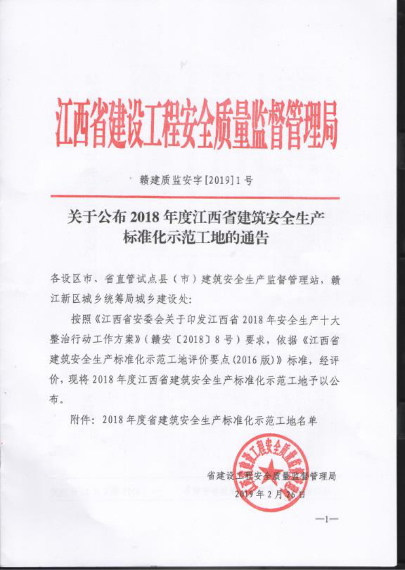 2018年全年安全創(chuàng)優(yōu)工作取得了顯著成績,江西省建筑工程安全質(zhì)量監(jiān)督管理局發(fā)布公告,我司承建的南水.中央公園(一期)項(xiàng)目被評為“2018年度江西省建筑安全生產(chǎn)標(biāo)準(zhǔn)化示范工地